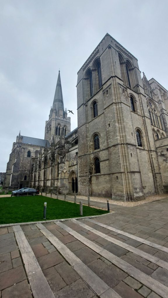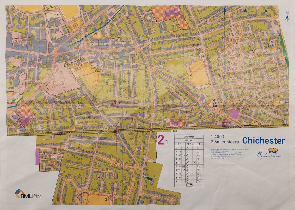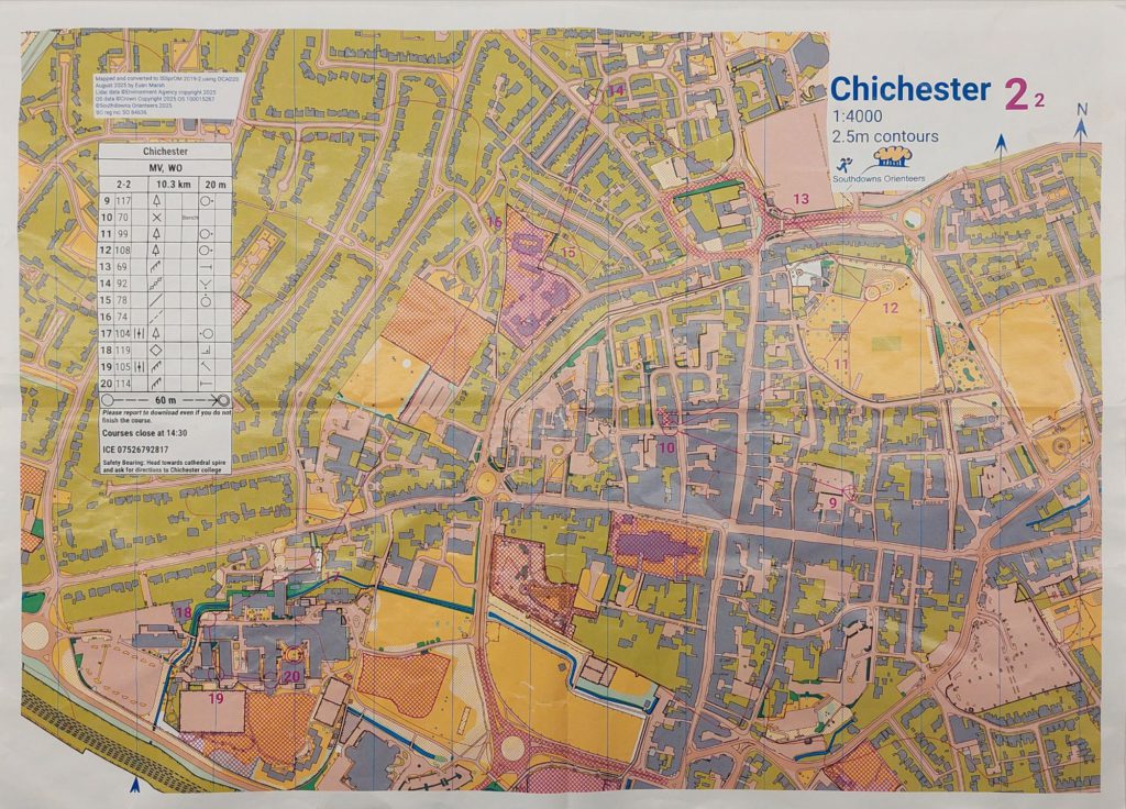 V pátek jsme se přesunuli na jih Anglie. V sobotu jsme absolvovali závod ve městě Chichester. Tam jsme očekávali závod ve sprintu (na 15 minut), ale místo toho jsme až při čtení pokynů a délek tratí zjistili, že se jedná o ve Velké Británii velice populární urban race (městský závod). To je standardně dlouhý závod v městských podmínkách. Veteránská kategorie H45 měla trať dlouhou 10,3 km po ideálním postupu. Běžela se na oboustranné mapě o rozměru A3 v měřítku 1:4000 a ekvidistancí 2,5 metru. Mapově se jednalo spíše o jednodušší závod ve velmi plochém terénu. Stavba tratí se bohužel nepouštěla do příliš složité zástavby. Proto bylo po většinu trati nejjednodušším pravidlem držet se hlavních ulic a zaběhnout do složitější zástavby pro konkrétní kontrolu. Zpestřením závodu nicméně byl průběh historickým centrem města se starobylou katedrálou. Název města, který obsahuje slovo „čestr“, znamená, že toto město bylo založeno již Římany a má tedy dlouhou historii. Před cílem byl ještě krátký úsek labyrintem kampusu Chichester College.