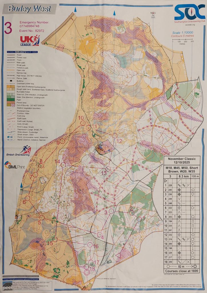 Nedělní závod pořádal Southampton Orienteering Club, jehož jsme byli s Petrou 3 roky členy a za který jsme nejen naběhali vyšší desítky závodů, ale některé závody také uspořádali. Hlavní motivací pro celý výlet byla účast na tradičním závodě, již 58. ročníku závodu November Classic (listopadová klasická trať), který letos byl netradičně uspořádán v říjnu. Závod se tradičně koná v národním parku The New Forrest. Prostor národního parku střídá starobylé dubové lesy se stále zelenými porosty cesmíny. Případně uměle vysazené jehličnaté lesy s různými a v kontinentální Evropě netradičními stromy – například hustníky ze zeravu západního (lidově túje) nebo jednotlivé obří sekvoje vždyzelené. Dalším typem terénu jsou pak otevřené plochy vřesovišť, jalovcových porostů nebo podmáčených travin. K tomu se zde volně pohybují divocí koně, poníci nebo i jiná zvěř.